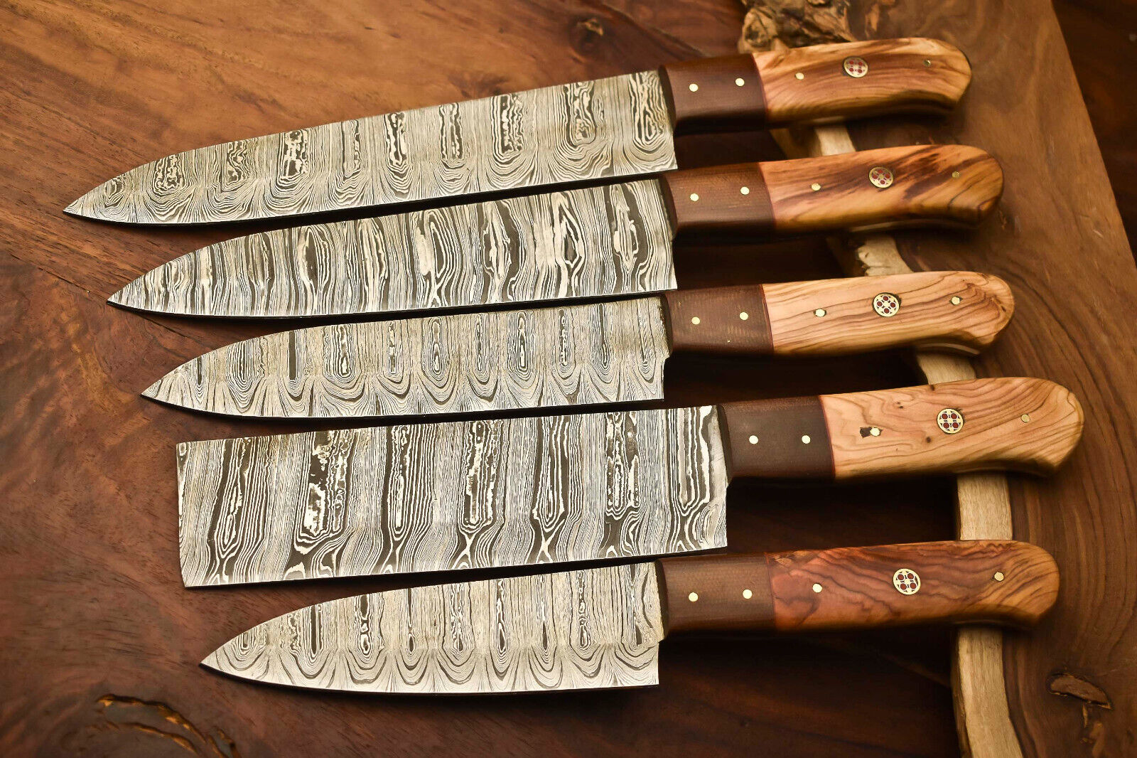 Set of 5 Handmade Hammered Damascus Steel Chef Knives – Custom Crafted Blades