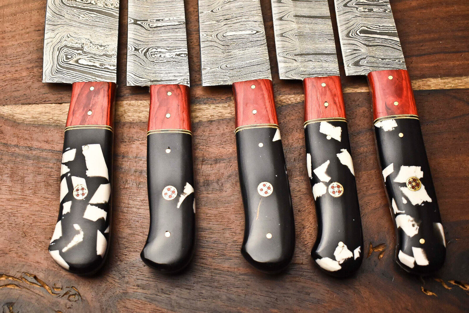This custom lot of 5 handmade hammered Damascus steel chef knives showcases exceptional craftsmanship and authentic materials. Our Damascus steel is genuine and not just an acid etch; it is created by heating and folding a combination of 1095 high carbon steel and 15N20 nickel carbon repeatedly to produce 384 layers. The blades are then carefully burned in acid, which brings out the stunning nickel satin color and blackish gray high carbon layers, exposing the unique Damascus pattern. After forging, the knives are high polished, buffing off the acid-burned layer on the handles while sharpening the blade edges to a satin finish. Every knife in this set is 100% handmade, ensuring durability, sharpness, and a one-of-a-kind look. This set is perfect for chefs and collectors who appreciate functional art in their kitchen tools.