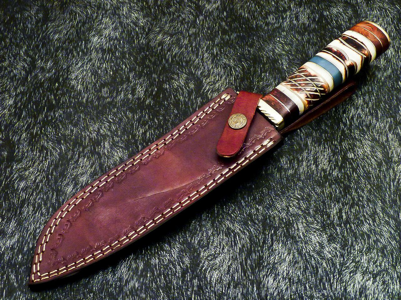 The handle, crafted from premium camel bone, is not only visually striking but also provides an ergonomic and secure grip, offering comfort and control during extended use. Robustly constructed with a thick spine, this knife is as durable as it is beautiful. More than just a tool, this knife is a gorgeous work of functional art, making it a most impressive centerpiece for any knife collection. This splendid knife represents a remarkable bargain for a piece of this caliber, delivered with the confidence that comes from unmatched craftsmanship.