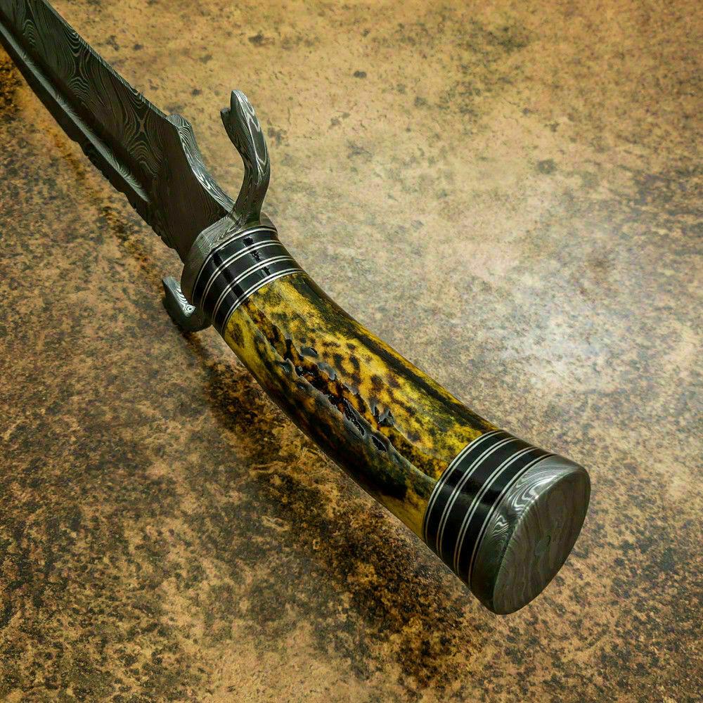 The Heritage Forge Titan Bowie Knife is a masterfully crafted hunting and collectible knife, combining traditional hand-forged Damascus steel with timeless design. This overall 14-inch knife features a 9-inch blade forged from multiple layers of high-carbon Damascus steel, ensuring unmatched strength, sharpness, and long-lasting edge retention.