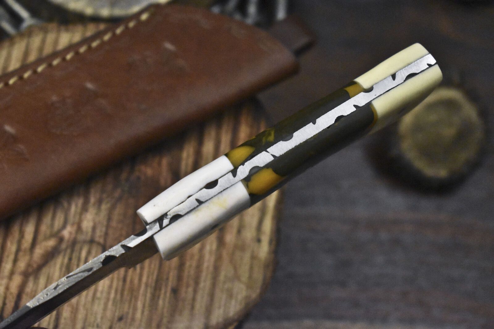 Constructed from high-carbon 1095 and 15N20 steel, the blade is folded multiple times to create a stunning twist pattern. After being acid etched, the layered steel reveals dramatic contrasts, combining visual appeal with resilience. This damascus knife custom handmade fixed blade hunting knife skinner is oil-tempered to a hardness of 58–60 HRC, delivering superior edge retention and cutting power in harsh conditions.