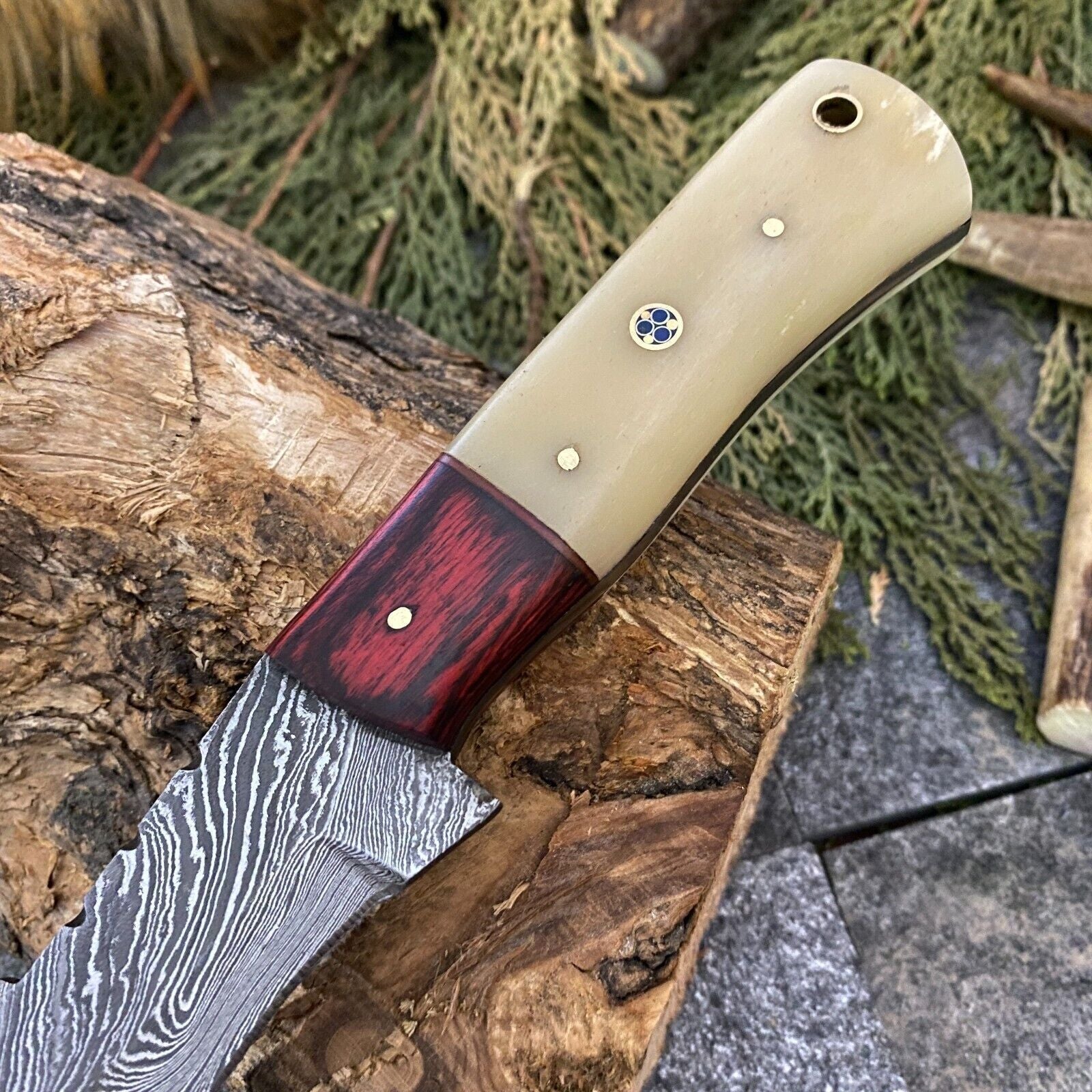 Twist Damascus Hunting Skinner Knife with Camel Bone and Wood Handle