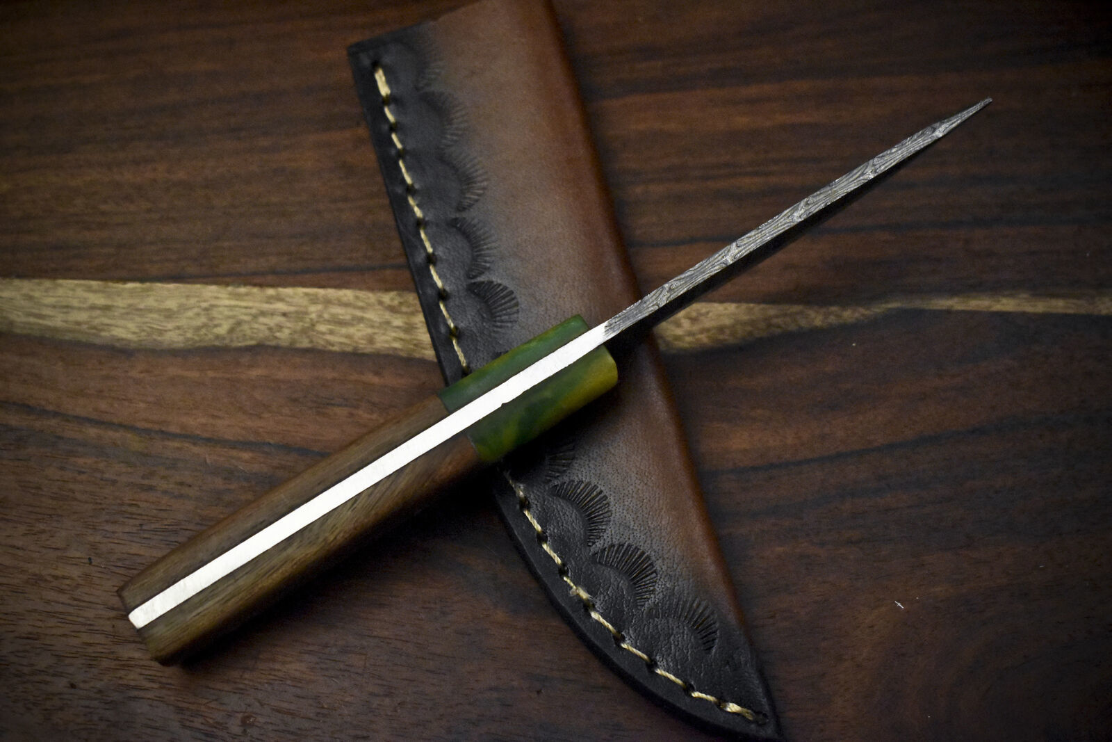 Ideal for camping or daily outdoor use, this knife also includes a custom leather sheath for secure carry and protection. Each piece is handmade, ensuring no two knives are alike. Whether you’re on the trail or displaying it in your collection, this skinner knife blends tradition, function, and style in a compact, practical form that performs when it matters most.