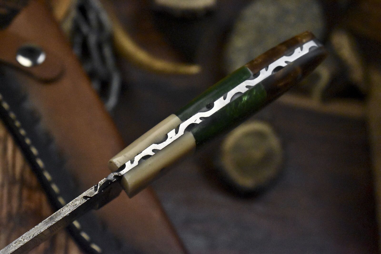The Corian handle is polished for comfort and grip, even in wet conditions, making it reliable in the field. Each knife is handmade, giving it a unique character. Whether you’re hunting, camping, or exploring the wild, this skinner knife is a powerful and elegant companion.