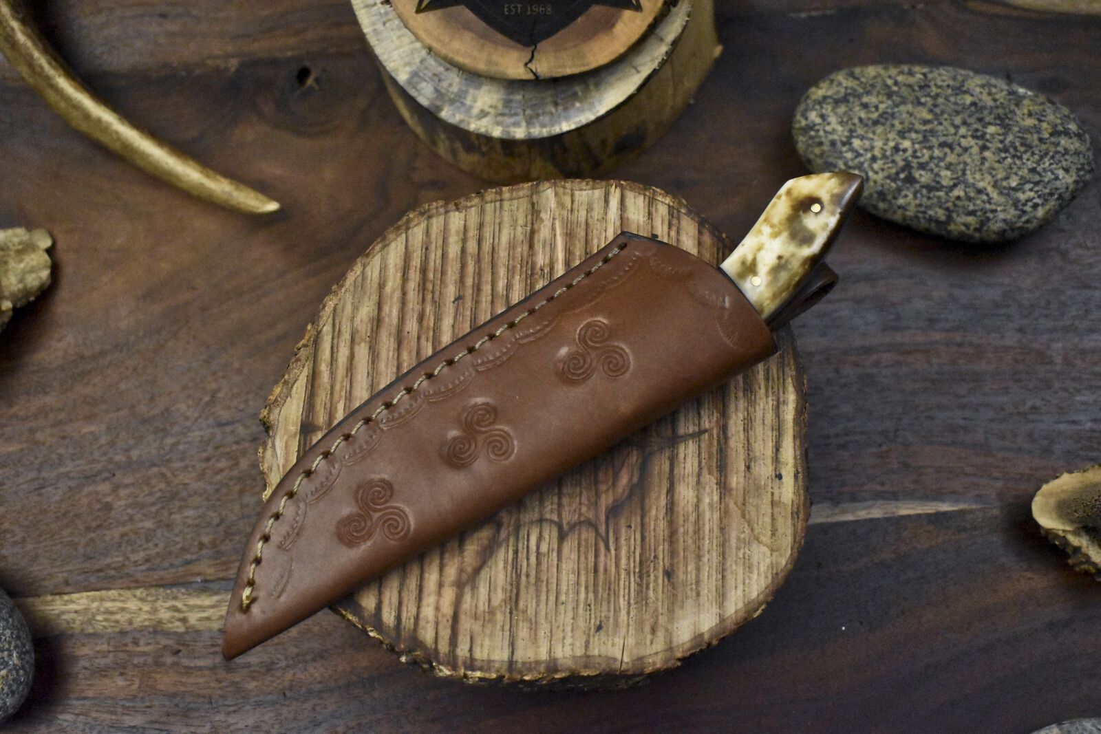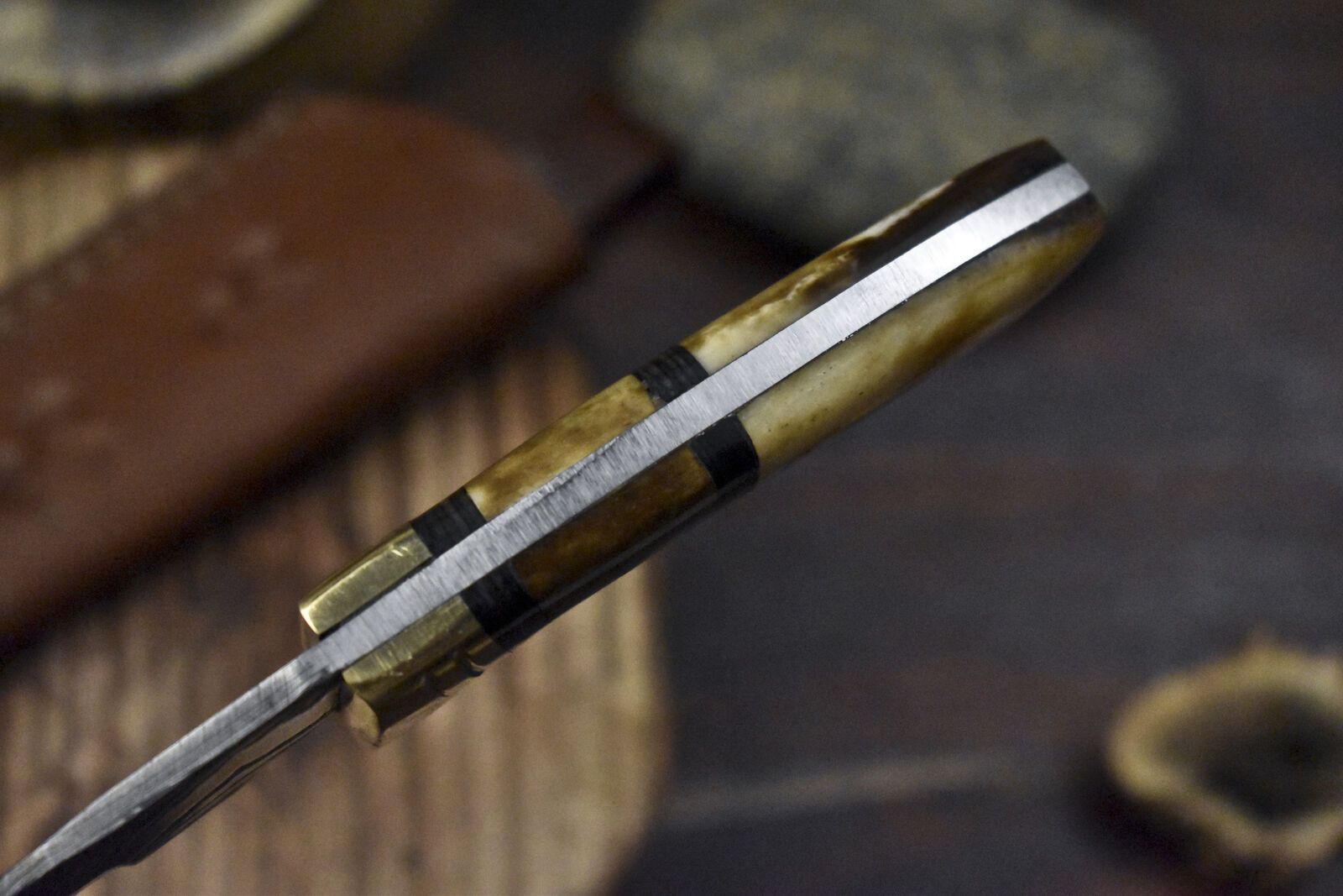 This handcrafted twist Damascus steel skinner knife is a functional and collectible tool built for everyday carry and outdoor adventures. Measuring 8 inches overall, it features a 4.5-inch sharp, acid-etched blade forged from layered 1095 and 15N20 steel, offering remarkable edge retention and strength. The dramatic twist pattern on the blade is a visual standout, showcasing the craftsmanship behind every curve. Paired with a 3.5-inch handle made from polished bone and fitted with a brass guard, this knife offers a refined look with a secure, balanced grip. The skinner-style blade is ideal for hunters, campers, and bushcraft enthusiasts, making it perfect for field dressing and precision tasks. This fixed blade knife comes with a thick, hand-tooled leather sheath that adds to its durability and style while providing safe transport. Whether you're adding to your collection or seeking a reliable Damascus deer horn skinner knife alternative, this piece is made to perform and built to last. Every detail reflects the dedication of traditional blade-smithing, making this skinner knife both a tool and a treasure.