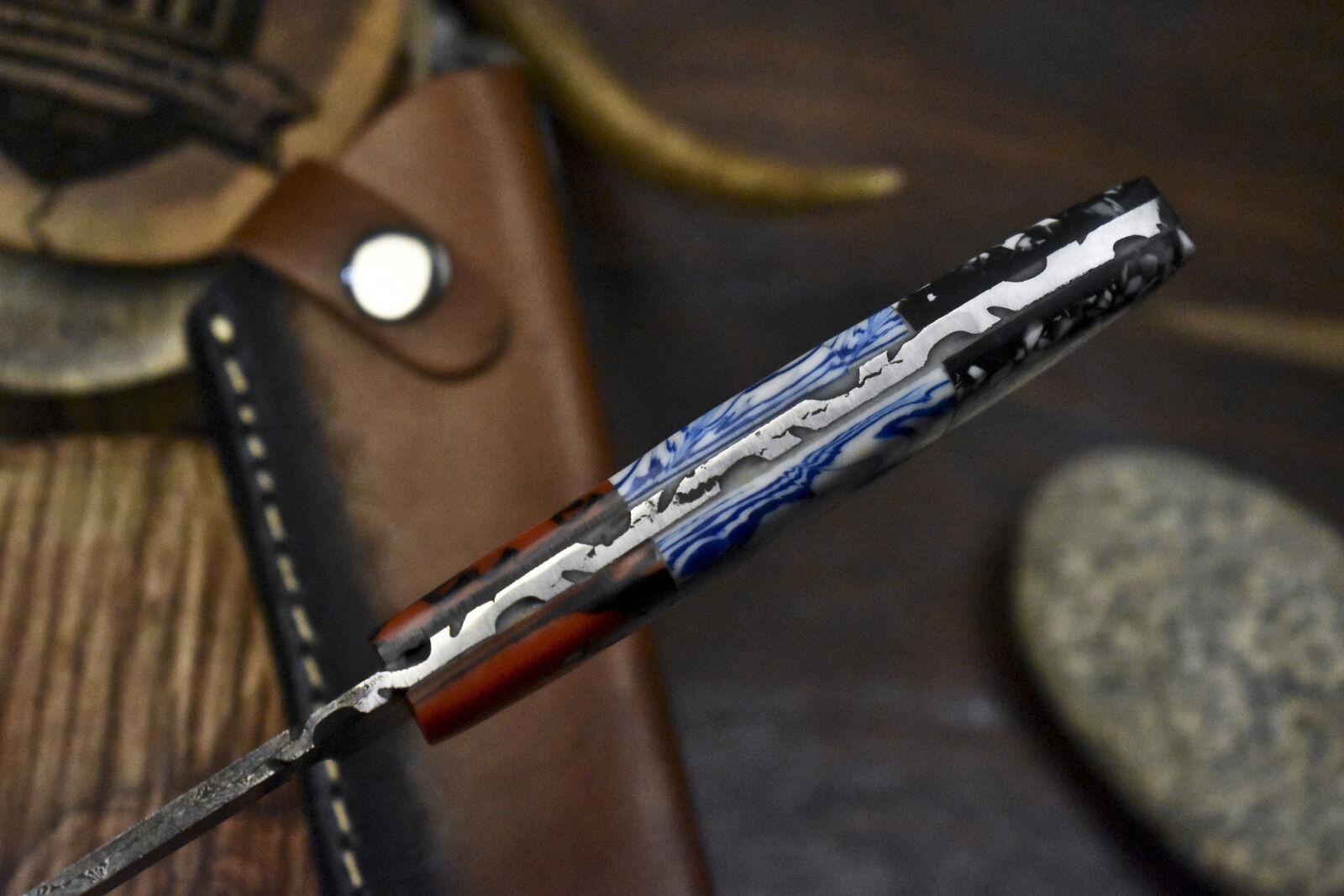 This premium damascus skinner knife is a must-have for campers, hunters, and collectors seeking both beauty and performance. Hand-forged with a stunning twist damascus pattern, the 5-inch blade is crafted from a blend of 1095 and 15N20 steels. Acid-etched to reveal the mesmerizing layered design, this blade isn’t just visually striking—it’s also durable, hardened to 58–60 HRC for edge retention and rugged outdoor use.