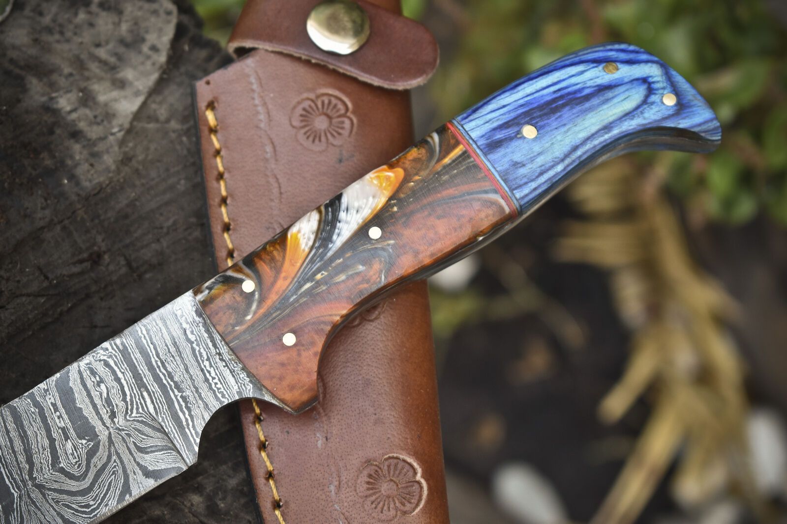 This 10-inch full tang damascus skinner hunting knife includes a uniquely crafted mixed material handle, offering a balanced grip and stunning aesthetic appeal. Whether used in survival situations or as part of your outdoor gear, this knife stands out for its functionality and handmade craftsmanship.