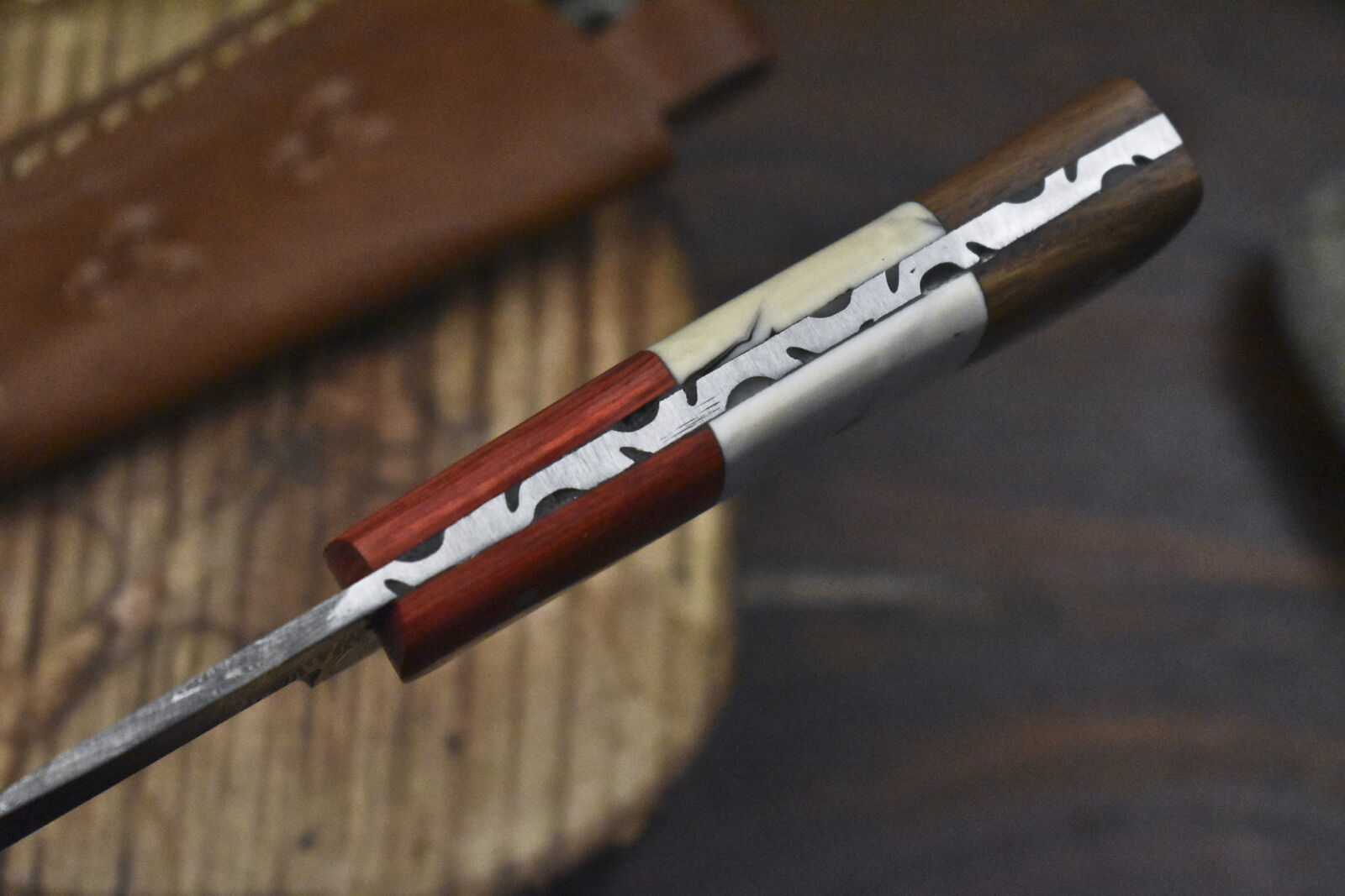 Twist Damascus Skinner Knife with Bone and Wood Handle for Camping & EDC Use