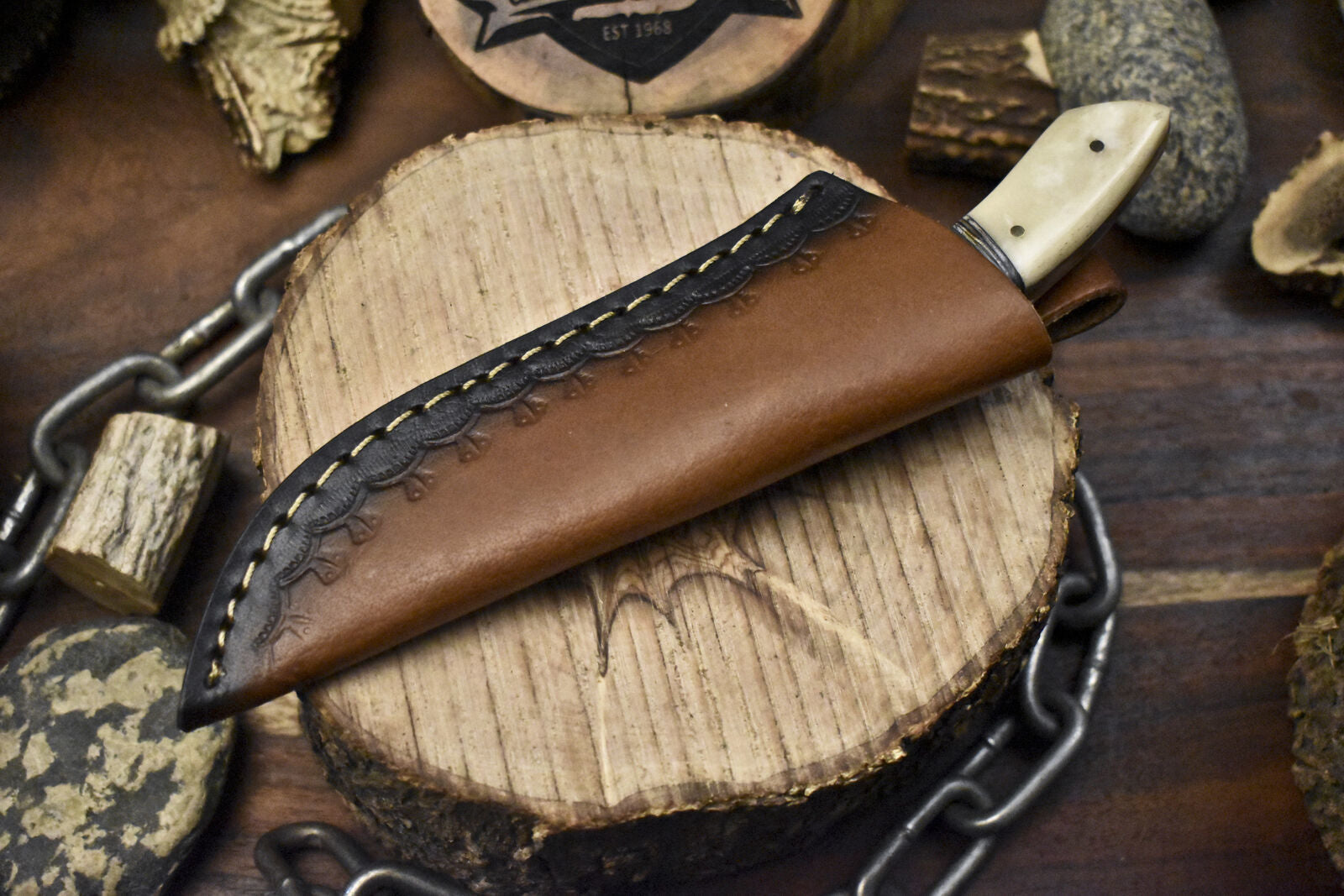 Included is a premium hand-tooled leather sheath, stitched for exceptional toughness, allowing for safe carry and storage. Whether for field dressing, skinning game, or as part of a curated knife collection, this bone handle Damascus skinner knife delivers both performance and timeless style. Each piece is 100% handmade, making every knife unique.