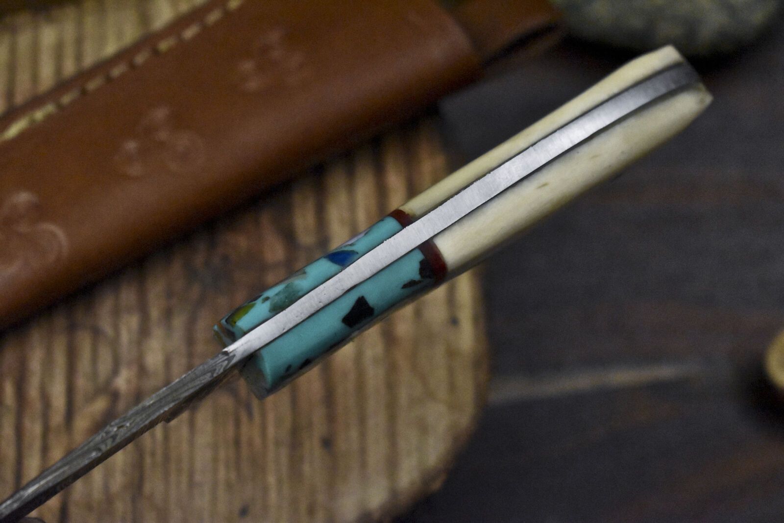 The polished bone handle offers a smooth, exotic texture, while the micarta bolster adds strength, balance, and a modern touch. The ergonomic shape ensures a secure grip during skinning or field dressing tasks. Each knife is completely handmade, with no CNC or precut blanks, making every piece one-of-a-kind.
