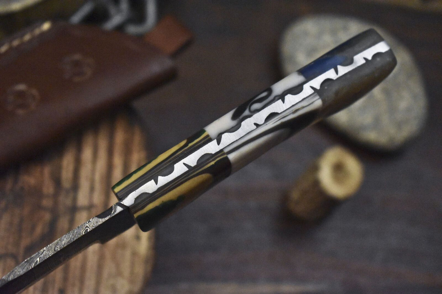 The Corain handle offers excellent grip in wet or dry conditions, making it a reliable choice for sportsmen, hunters, and collectors. A custom leather sheath is included for safe storage and carry. If you're looking for a dependable and visually stunning damascus skinner knife for sale, this one blends functionality with unique artistry.