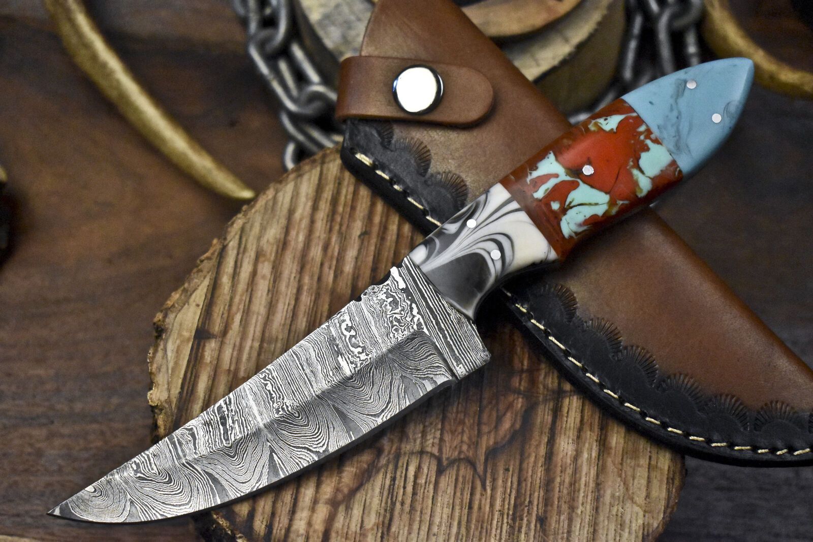 Whether you're after a dependable Damascus skinner hunting knife or a collector’s showpiece, this knife delivers top-tier performance and craftsmanship. A custom leather sheath is included for safe storage and portability. If you're searching for a Damascus skinner knife for sale, this forged blade with unique character and top materials is your perfect companion.