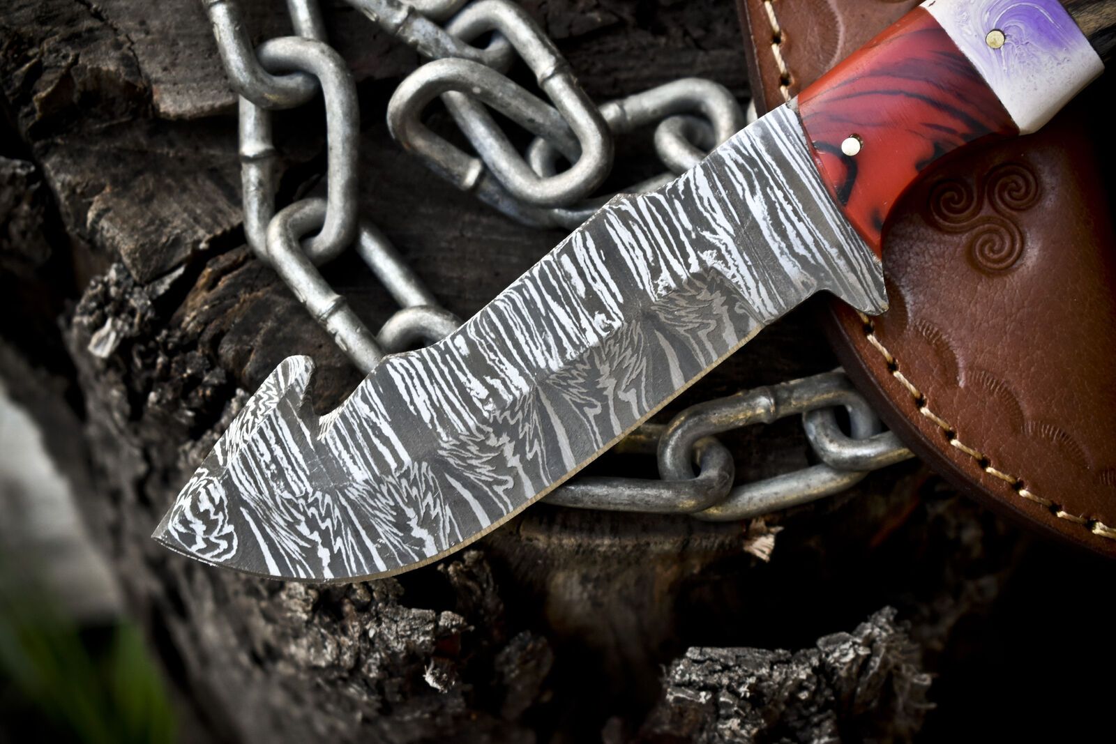 The ergonomic hard wood handle provides a strong grip, and the Micarta bolster ensures safety during tough tasks. The gut hook adds utility, enabling quick and efficient field dressing of deer, elk, and other large game. This damascus knife custom handmade fixed blade hunting knife skinner is fully oil tempered to a hardness of 58–60 HRC, ensuring edge retention and strength.