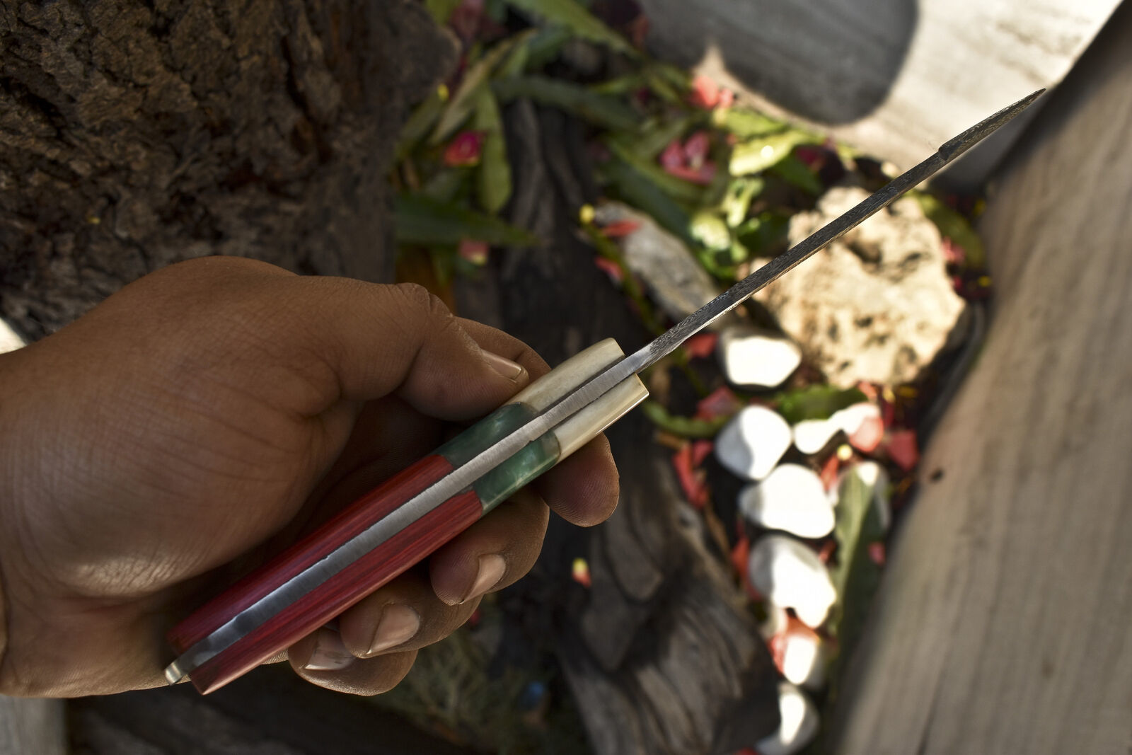 The integrated gut hook allows for safe, controlled field dressing of deer, elk, and other game, making it an indispensable hunting companion. Its wide, short blade profile excels in skinning, while the rigid edge ensures no flex during cutting. Each knife is 100% handmade, ensuring a unique pattern and character. The knife includes a hand-tooled, extra-stitched leather sheath for secure carry and protection. A blend of artistry and utility, this knife is as much a collectible as it is a dependable outdoor tool.