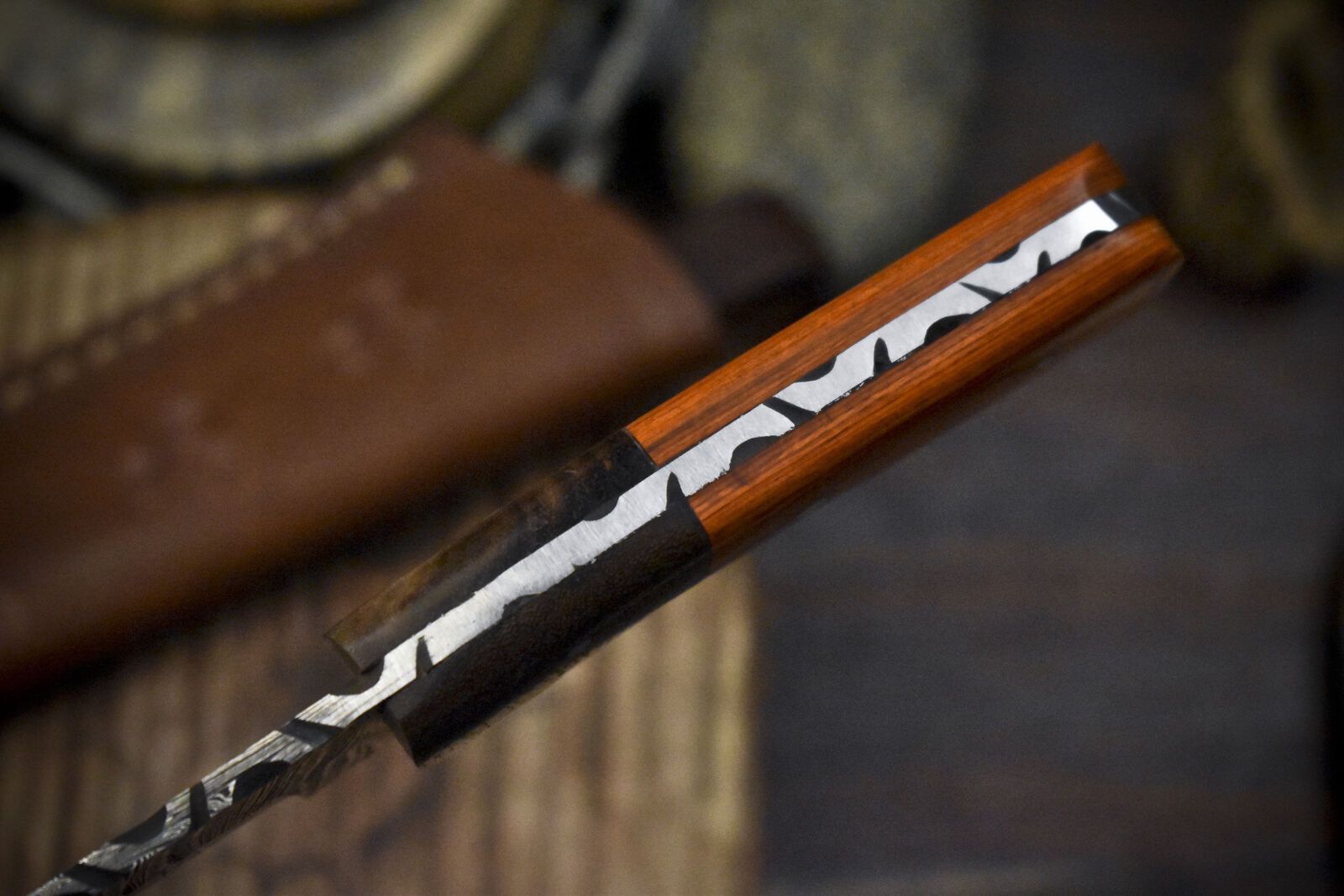 Crafted from a fusion of 1095 and 15N20 high-carbon steels, this damascus knife custom handmade fixed blade hunting knife skinner is heat-treated and acid-etched to reveal a vibrant twist pattern. This technique not only gives the blade its signature swirling aesthetic but also enhances durability and edge retention.