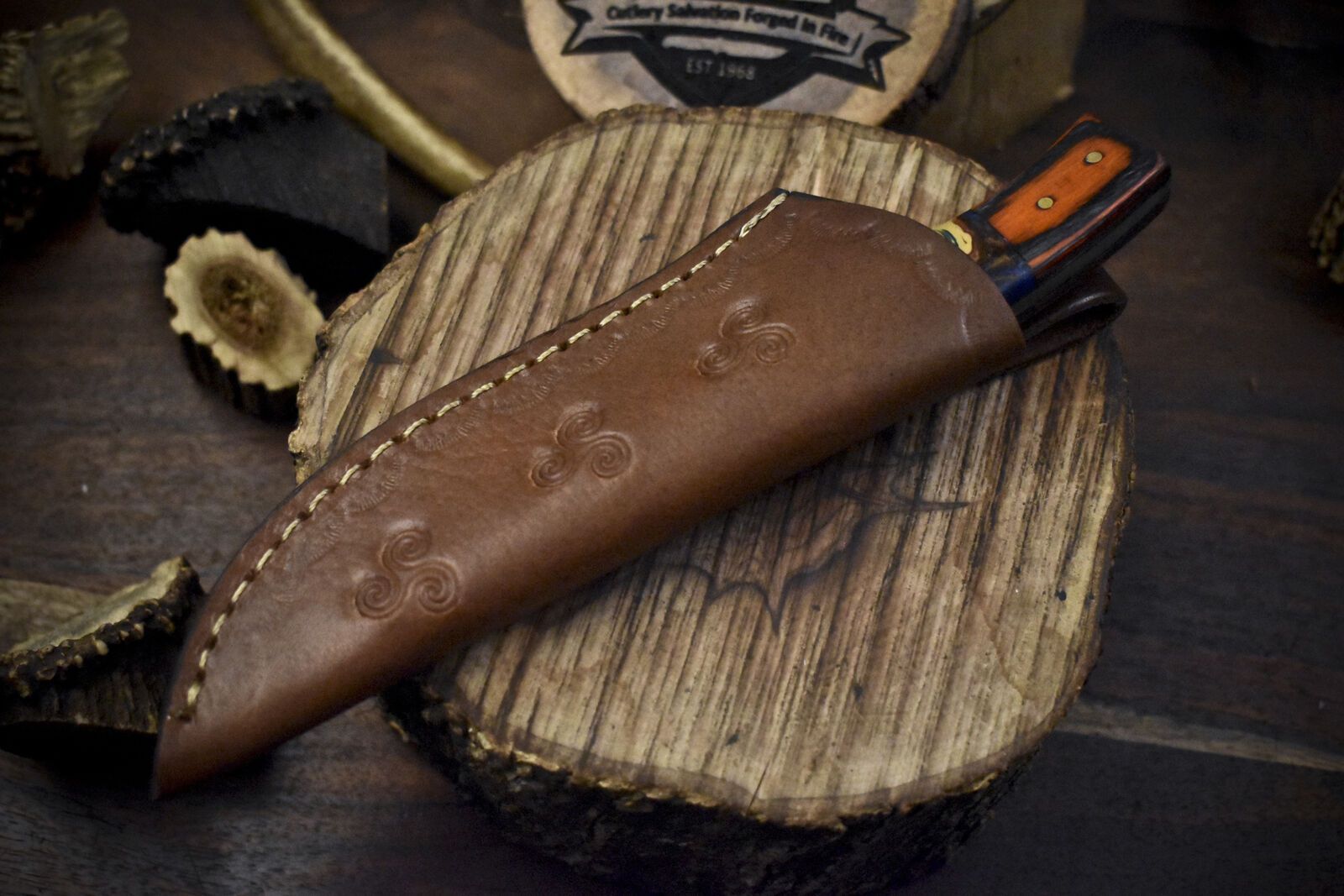 Each knife includes a hand-tooled, heavy-duty leather sheath with reinforced stitching, designed for secure carry and long-term protection.