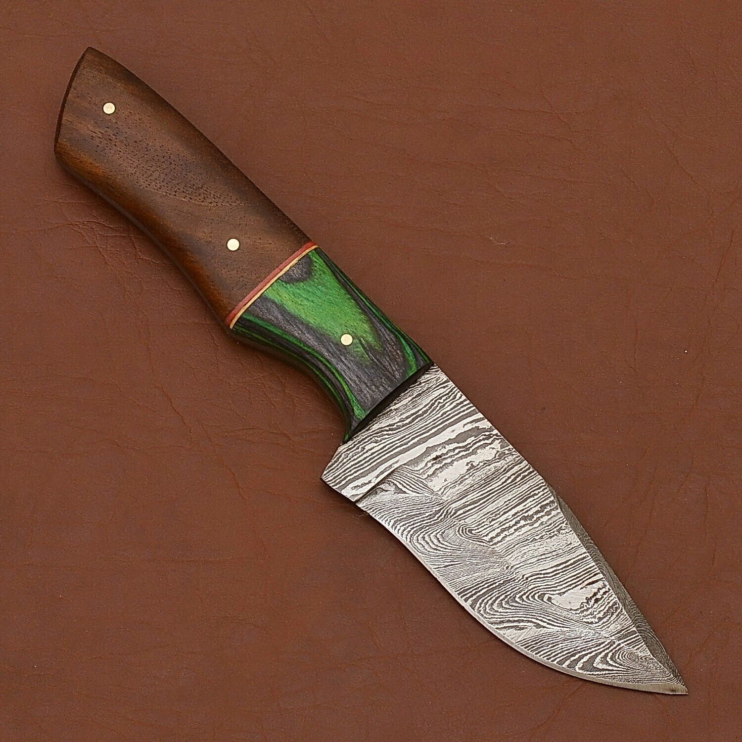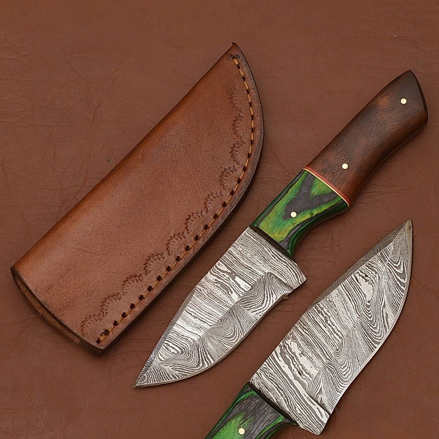 Twist Damascus Skinner Knife with Wood Handle and Leather Sheath for Hunting and Camping