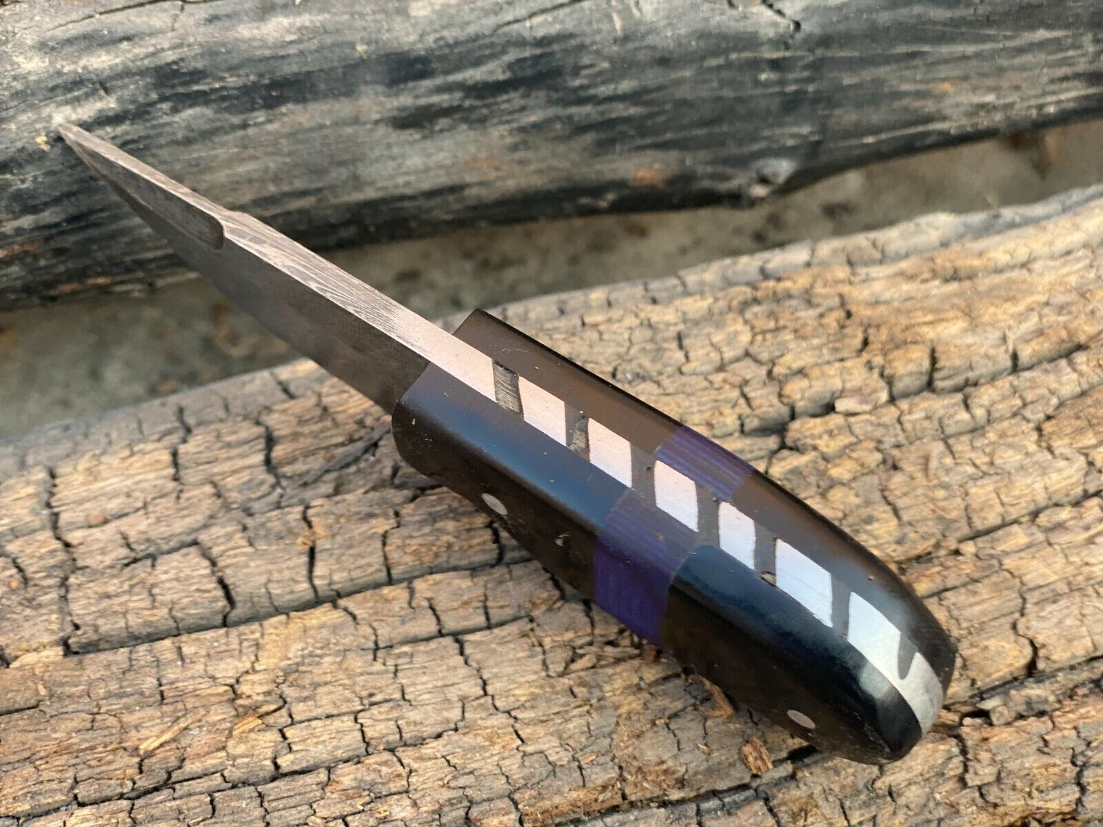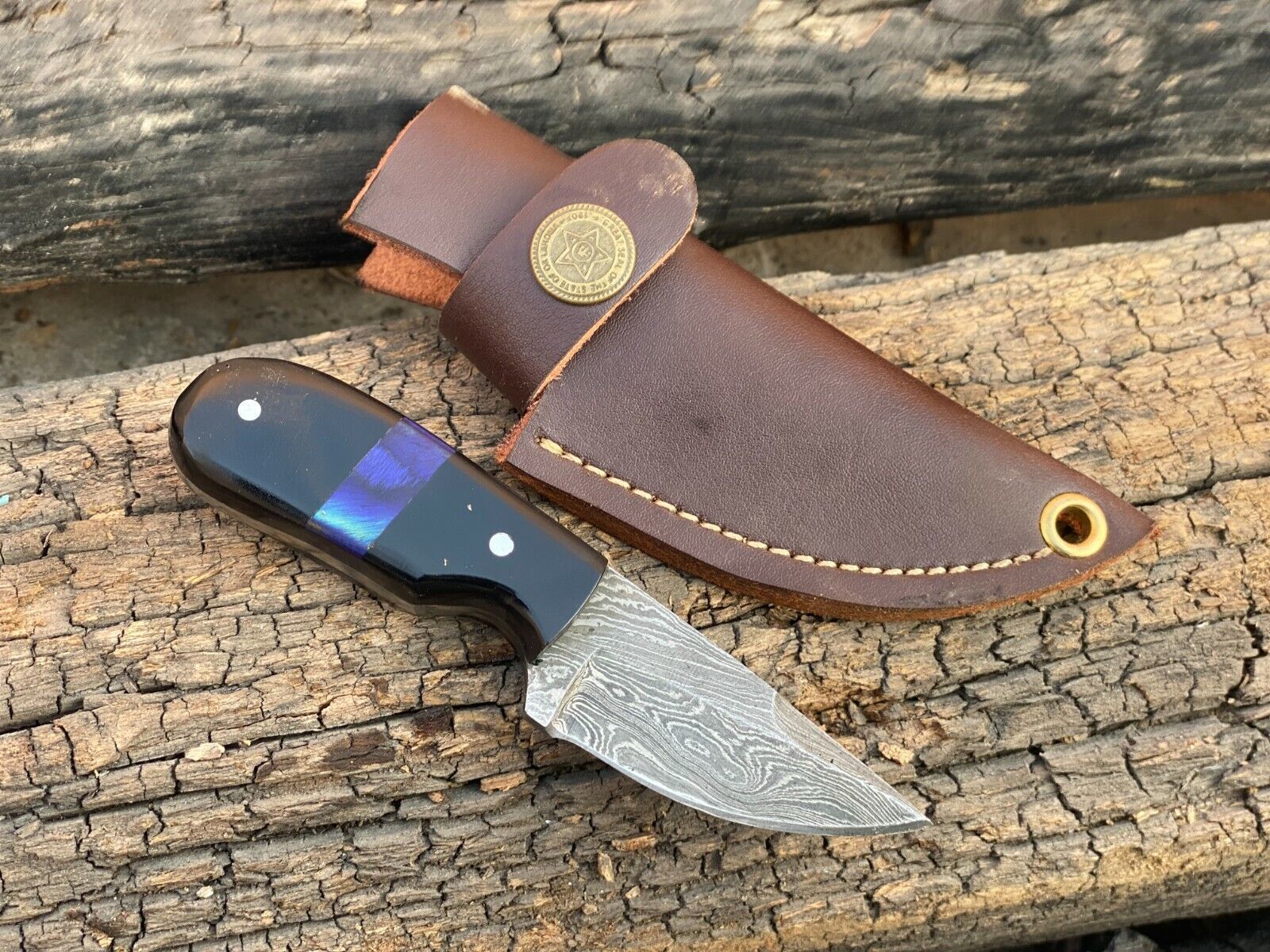 A handmade leather sheath is included, offering safe storage and easy portability. Each knife is 100% handmade, ensuring unique blade patterns and handle variations. Designed with quality craftsmanship and practicality in mind, this mini skinner knife combines portability, performance, and artistry in one compact package.
