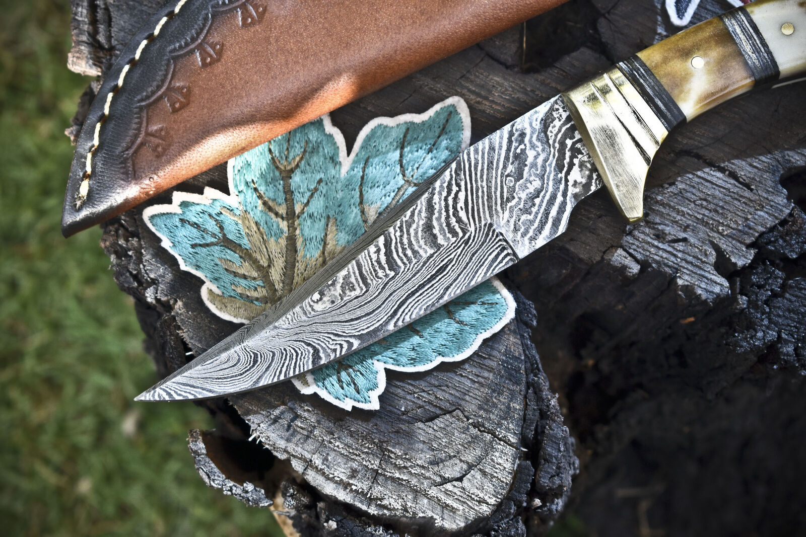 The bone handle offers a smooth, refined grip and an elegant, timeless look, while the brass guard adds both visual contrast and hand protection. Each knife comes with a hand-tooled leather sheath for safe carrying and storage, making it ideal for hunting, skinning, camping, or display. A functional work of art, this knife is an exceptional gift for hunters, outdoorsmen, and knife collectors.