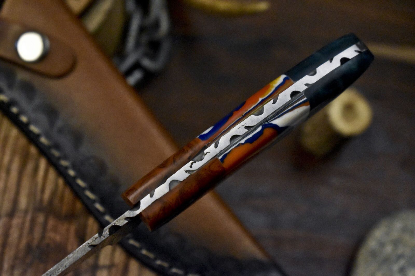 Perfect for collectors or outdoor enthusiasts, this damascus acid etched fixed skinner knife combines elegance and function in one timeless design.
