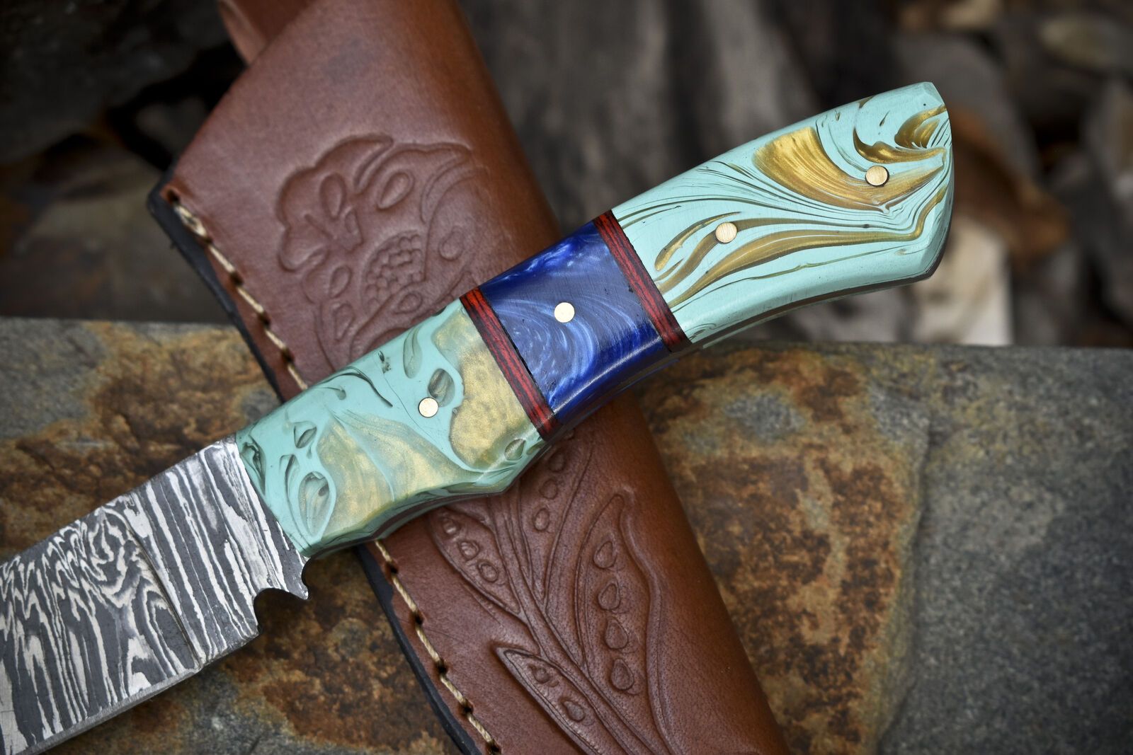 A true tactical tool, this damascus acid etched fixed skinner knife includes a thick, hand-tooled leather sheath for safe carry and storage. Whether used in the field or displayed in a collection, this damascus skinner hunting knife stands out for its craftsmanship and performance.