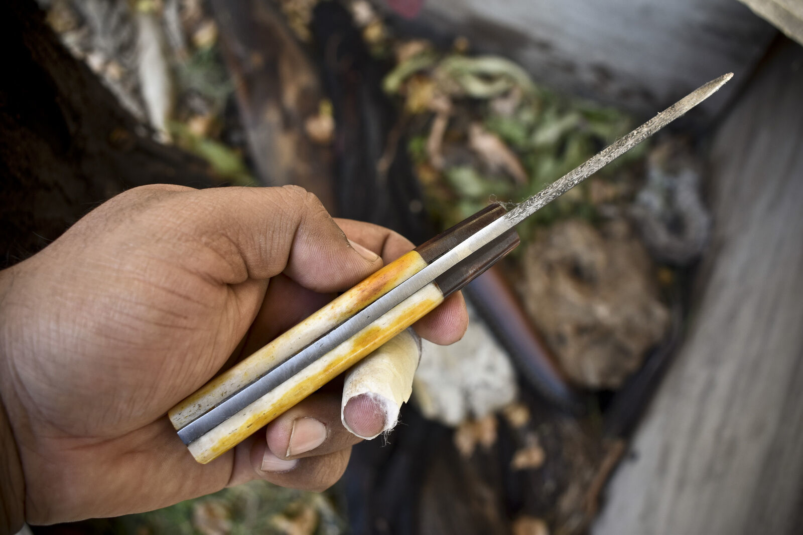 This custom handmade fixed blade hunting knife skinner blends elegance, durability, and functionality in one remarkable tool. Expertly forged from premium Damascus steel using a combination of 1095 and 15N20, the blade is repeatedly folded, oil tempered to 58–60 HRC, and acid-etched to reveal a bold twist pattern. The intricate swirling design shifts between deep blacks and bright silvers, making each Damascus skinner hunting knife truly one-of-a-kind. Measuring 7.5 inches overall, it features a 4-inch razor-sharp, rigid blade ideal for hunting, skinning, and everyday carry. The handle is crafted from polished, ethically sourced bone, providing a smooth texture and natural elegance, while the micarta bolster ensures strength and stability. Designed for both collectors and outdoorsmen, this handmade skinner Damascus knife comes with a premium hand-tooled leather sheath for safe storage and field carry. With its full tang construction, unique patterning, and exceptional edge retention, this Damascus acid etched fixed skinner knife is both a functional tool and a collectible masterpiece.