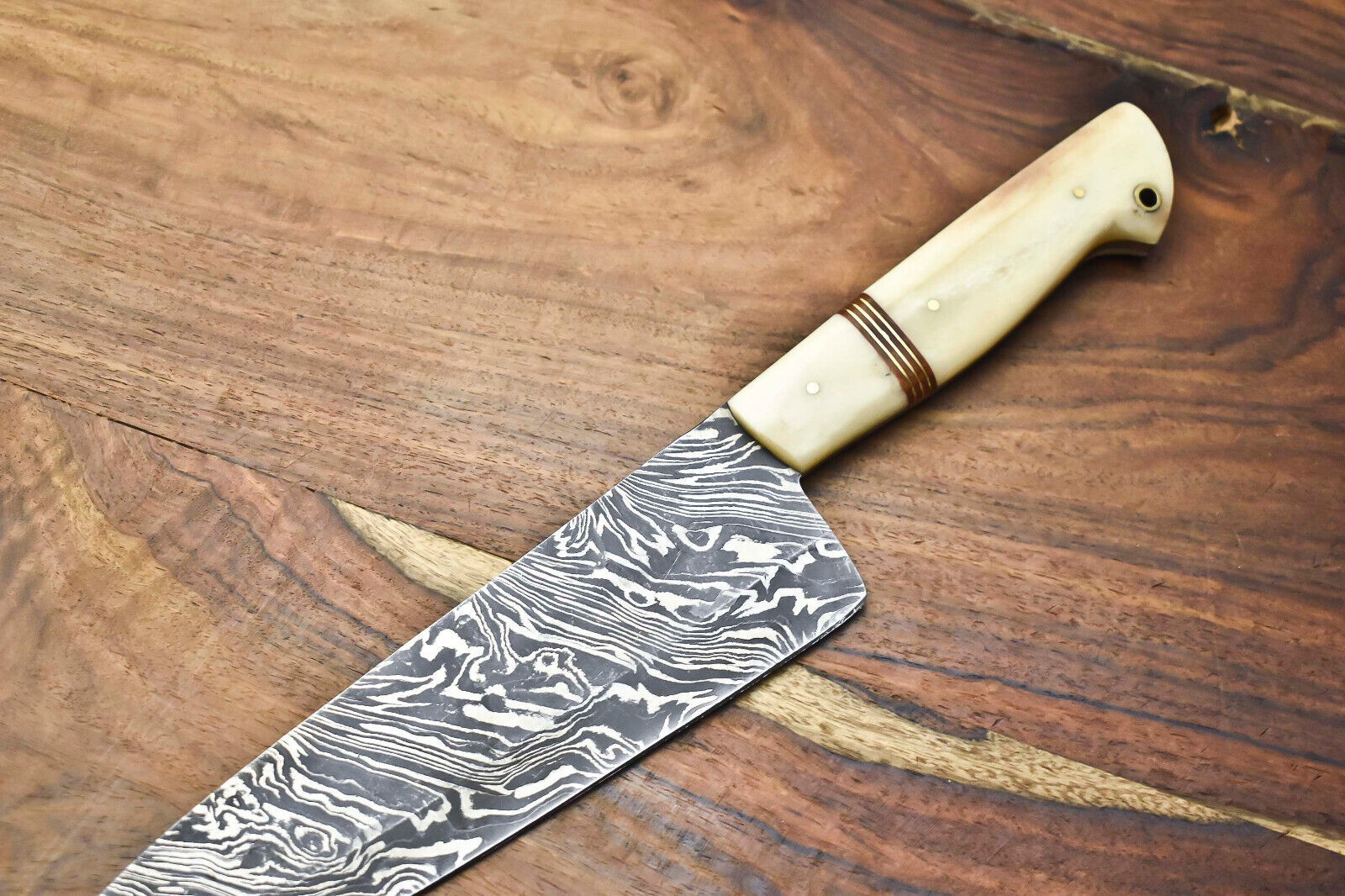 This custom handmade Damascus steel chef knife features a blade forged from 384 layers of 1095 high carbon steel and 15N20 nickel carbon steel. Unlike simple acid etching, our Damascus steel is authentically created by repeatedly heating and folding the metals, resulting in a strong, layered blade. The blade is then acid-treated, which transforms the nickel layers into a satin silver color and the high carbon layers into a blackish gray, beautifully revealing the signature Damascus pattern. While polishing the metal creates a shiny satin finish typical of steel, the distinct layered pattern only appears after the acid burn process. After forging, we high polish the handles for a smooth and elegant finish, and sharpen the blade edge to a razor-sharp satin finish by buffing off the acid layer. This full tang knife offers excellent strength, balance, and precision — perfect for chefs, collectors, and outdoor enthusiasts.