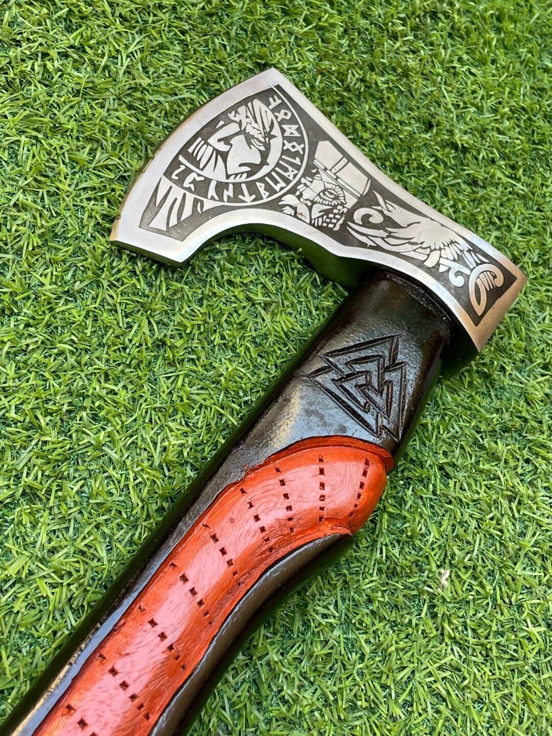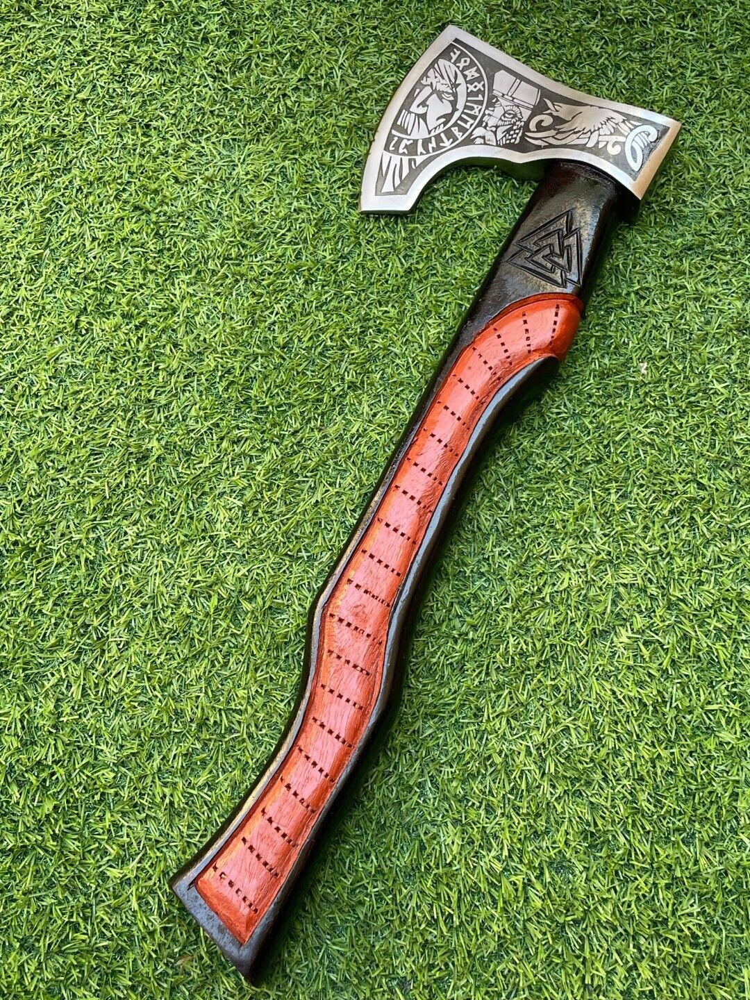 The multi-color wooden handle provides a secure, ergonomic grip, making it ideal for throwing, camping, bushcraft, or tactical use. Designed for ambidextrous handling, this axe blends historical Viking style with modern functionality, making it a standout piece for collectors and outdoor enthusiasts alike.