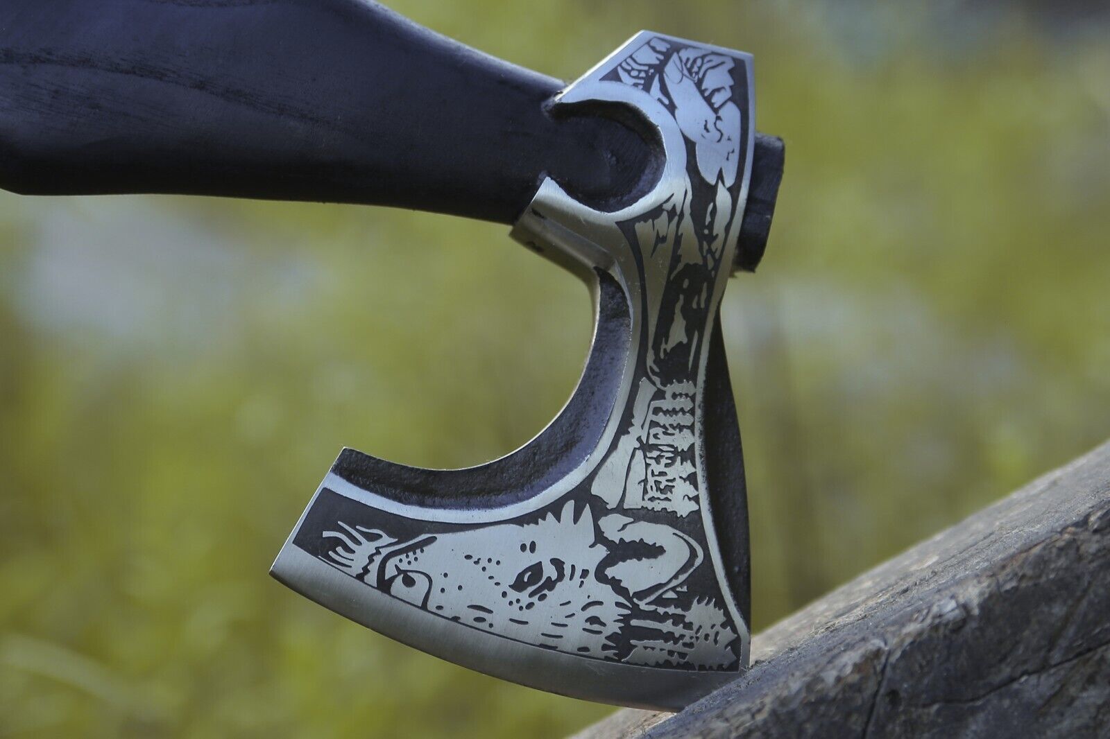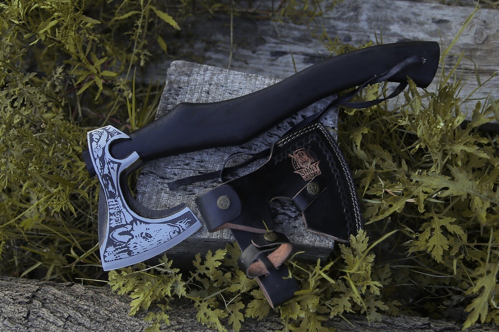 This handmade Viking axe is a perfect blend of functionality, craftsmanship, and aesthetic appeal. Forged from high-quality carbon steel, the bearded hatchet features a sharp, durable cutting edge designed for camping, bushcraft, and outdoor use. The solid wood handle is treated with oil and hard wax, enhancing its natural beauty while providing extra strength and a comfortable grip. The axe measures approximately 20 inches in overall length, making it balanced and easy to handle for chopping wood, logging, or other outdoor tasks. Each axe comes with a custom leather sheath that protects the blade and fits perfectly, ensuring safe storage and transport. The axe also features intricate carvings and custom engraving, making it not only a practical tool but also a stunning gift for him, his father, boyfriend, brother, friends, or anyone who loves woodworking, hiking, camping, and other outdoor adventures. This Viking axe is fully functional, combining traditional Norse design with modern craftsmanship.