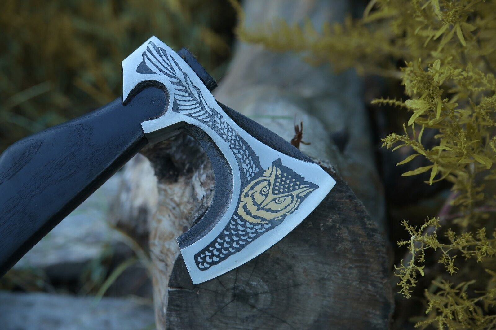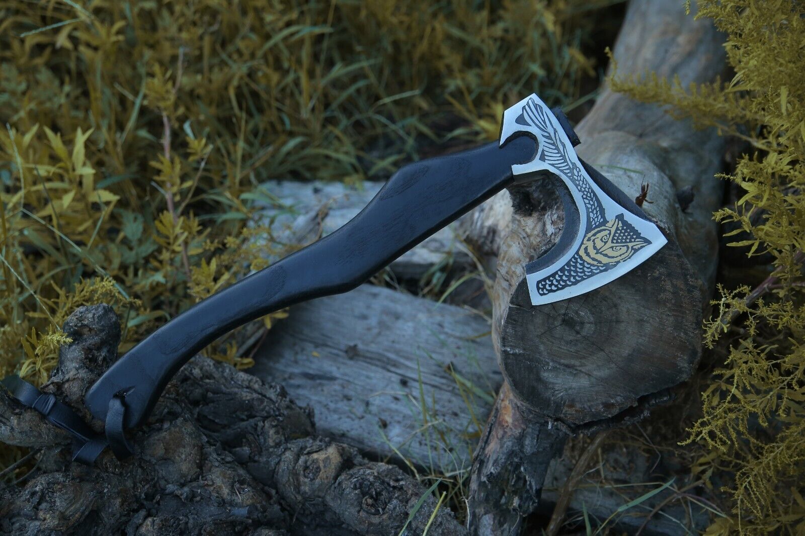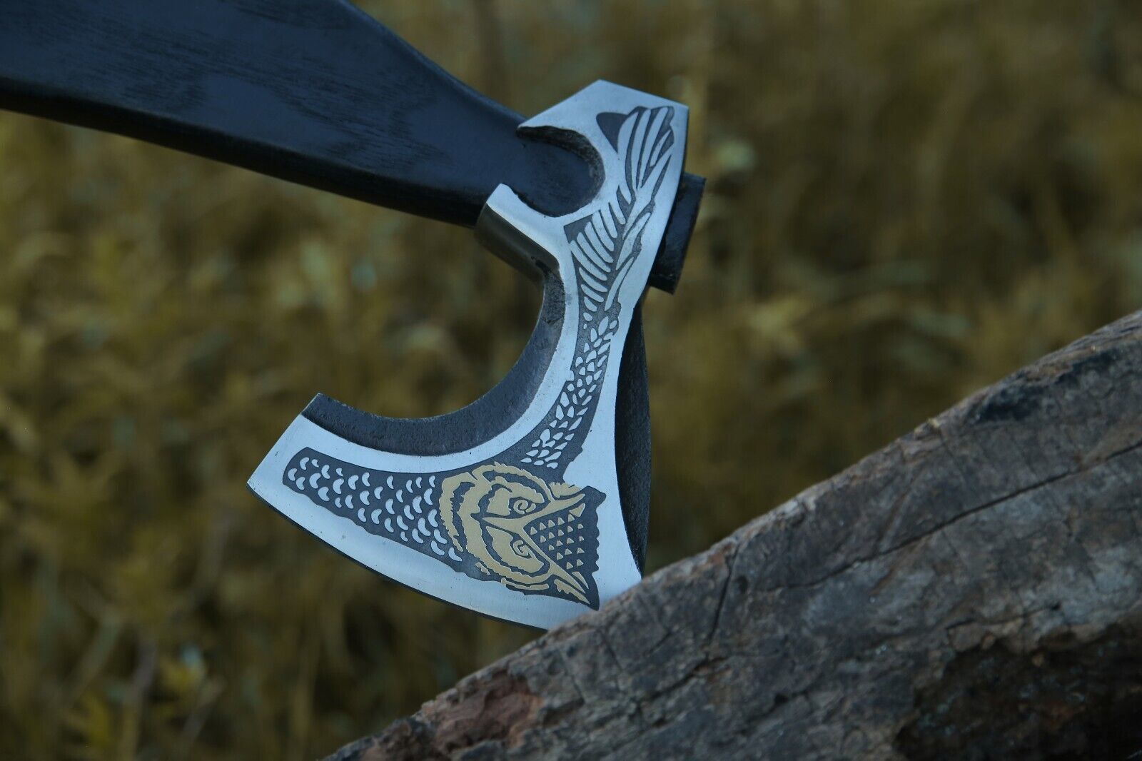This handcrafted Viking Axe is a true masterpiece, combining traditional Norse design with practical functionality. Measuring approximately 20 inches in overall length with a 5-inch cutting edge, this bearded axe is perfect for camping, woodworking, and outdoor adventures. The hand-forged high-carbon steel blade offers a razor-sharp edge, while the solid ash wood handle is treated with oil and hard wax to enhance its natural beauty and durability. Each axe comes with a custom leather sheath that fits the blade perfectly, providing protection and an elegant presentation. The axe head features intricate carvings and etchings, making every piece unique and collectible. Designed for both functional use and display, this Viking Axe is ideal for cutting wood, chopping logs, or showcasing in a collection. Its robust construction ensures full functionality while maintaining a smooth, refined finish. This versatile axe makes a perfect gift for collectors, outdoor enthusiasts, or anyone who appreciates quality craftsmanship and Viking-inspired tools.