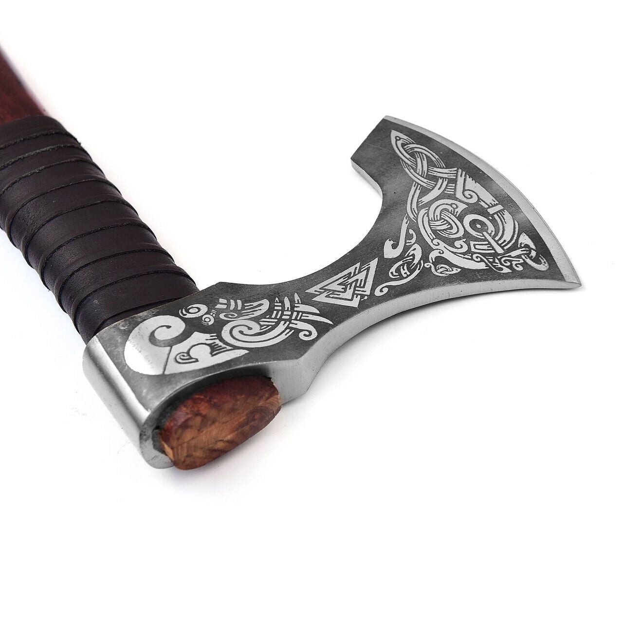 Unleash the warrior spirit of the Norse age with this hand-forged Viking medieval battle axe, a masterfully crafted piece that blends artistry and function. The carbon steel blade is decorated with intricate Viking imagery, giving it a striking and historically inspired design. Each curve and etching reflects the traditions of Viking craftsmanship, making this axe both a formidable tool and a collector’s showpiece.