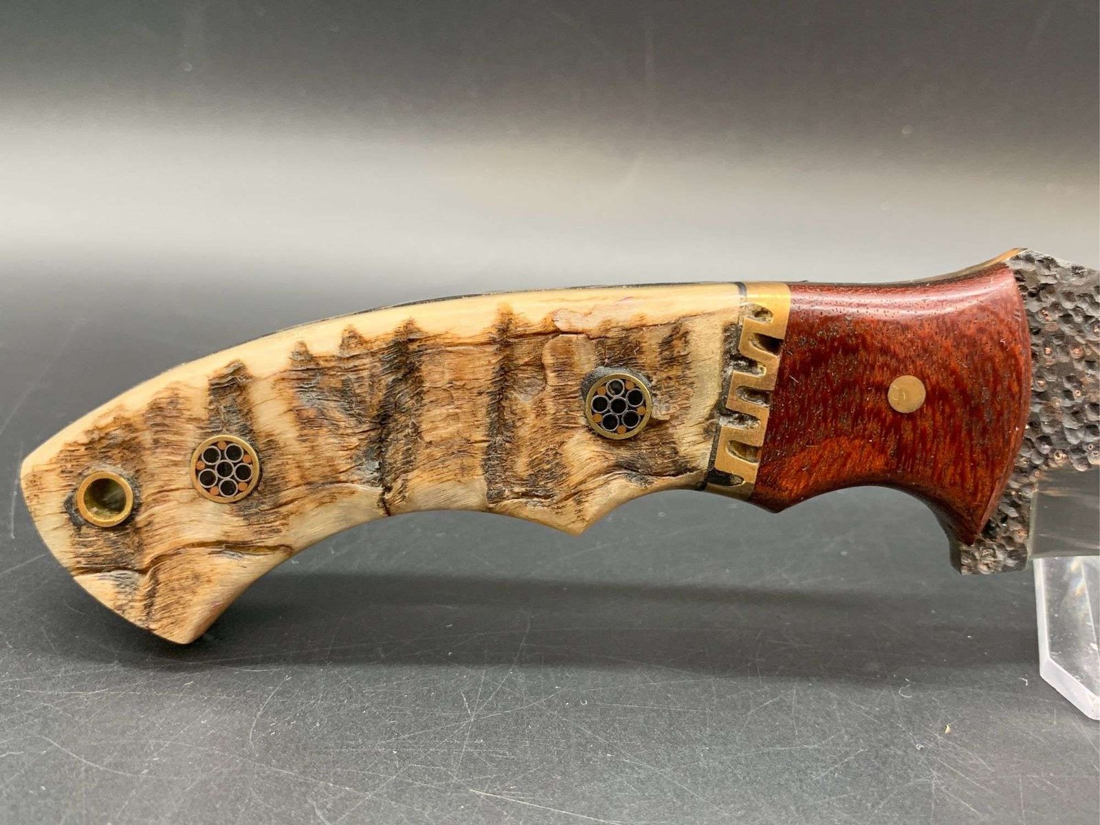 The Whole Earth Supply Tracker Knife combines rugged durability with timeless craftsmanship. Featuring a hammered Damascus steel blade, this tracker knife delivers superior sharpness and strength, making it the perfect tool for hunting, skinning, bushcraft, and outdoor survival.The stag handle not only provides a natural, ergonomic grip but also adds a classic and rustic aesthetic, making this knife both highly functional and collectible. The tracker-style blade is designed for versatility, handling everything from chopping and slicing to detailed skinning tasks with precision.Whether you’re a seasoned outdoorsman, collector, or someone seeking a reliable companion for camping and survival, this hand-forged Damascus tracker knife is an exceptional choice.